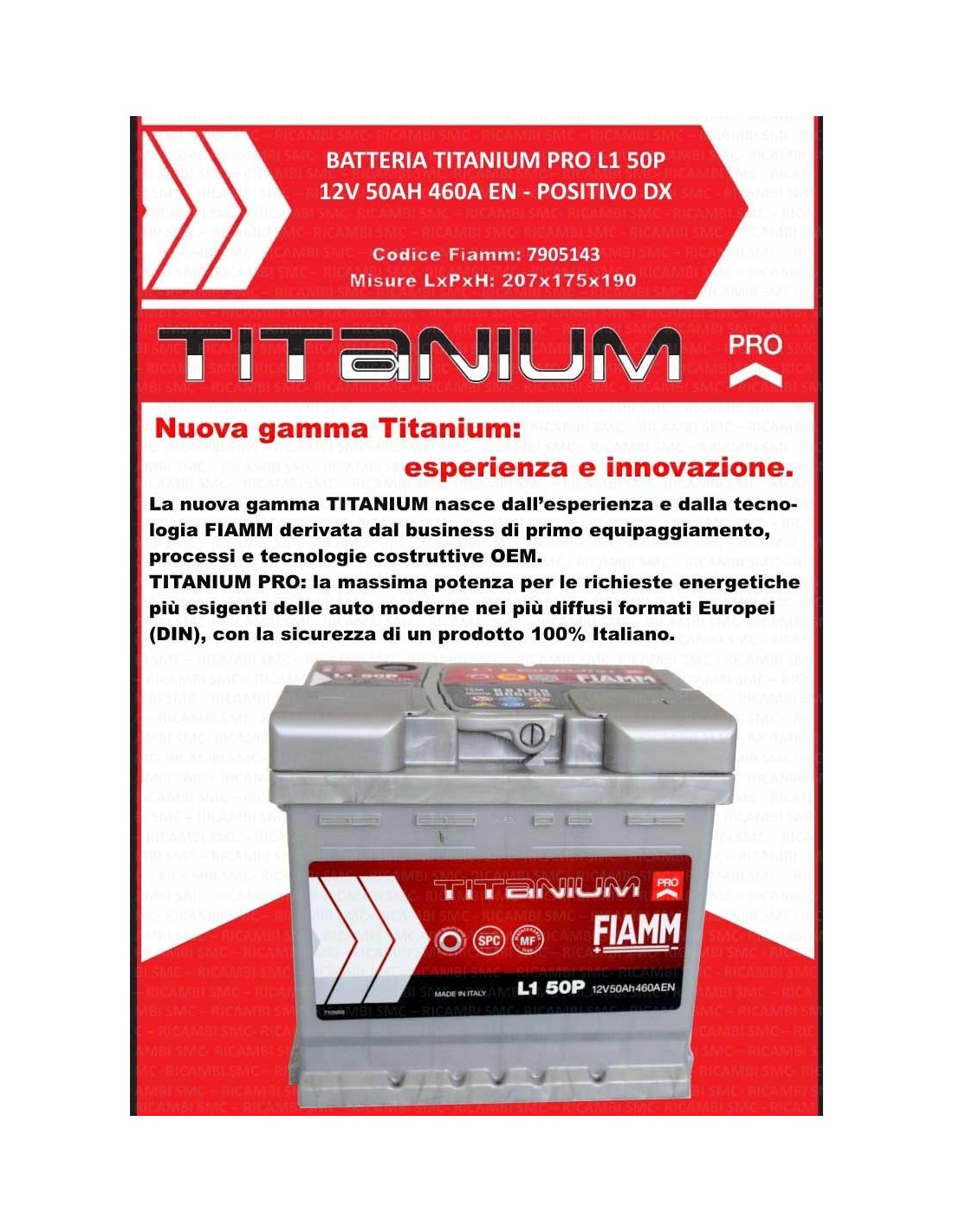 Appartiene alla gamma FIAMM Titanium, sinonimo di qualità costruttiva e lunga durata. È dotata di poli standard incassati, gruppo dimensionale L1 e fissaggio alla base B13, con piedini presenti su tutti i lati, per assicurare una perfetta compatibilità con numerosi modelli di veicoli.