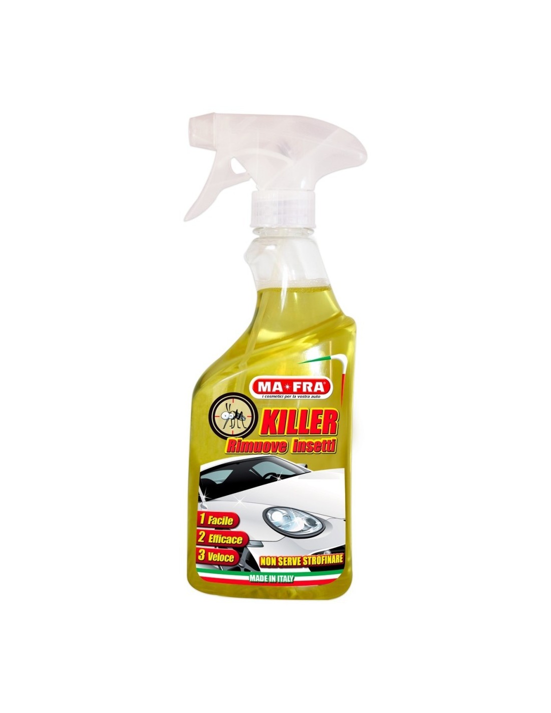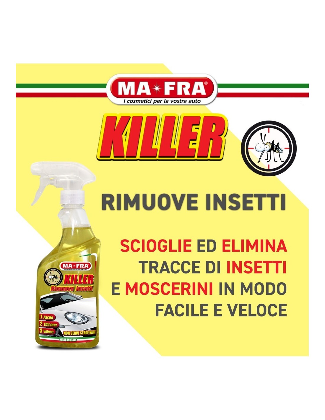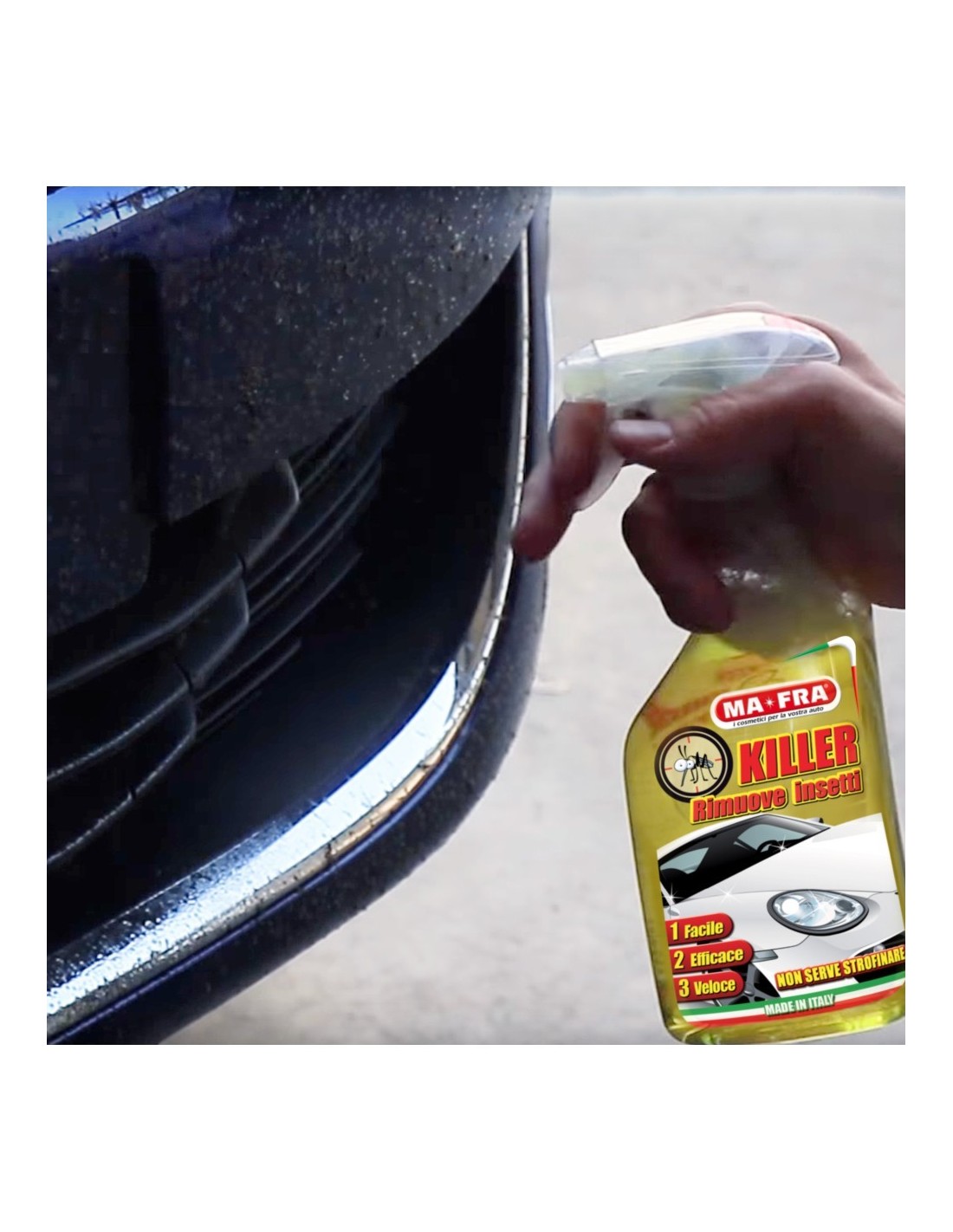 Killer di Ma-Fra nasce dalla ricerca professionale nei laboratori Ma-Fra per offrire una soluzione efficace e rapida contro ogni tipo di residuo organico sulla carrozzeria dell’auto. Insetti, moscerini, zanzare, ma le antiestetiche macchie come residui biologici di volatili dalla carrozzeria o dal tetto della vostra auto senza lasciare alcuna traccia.