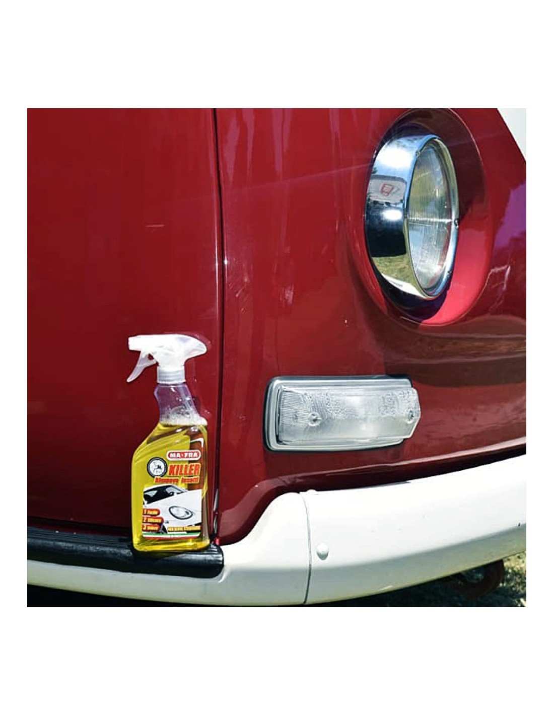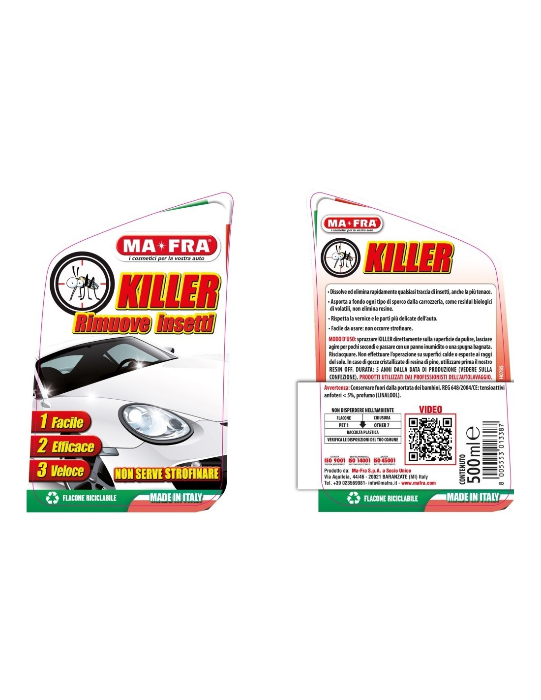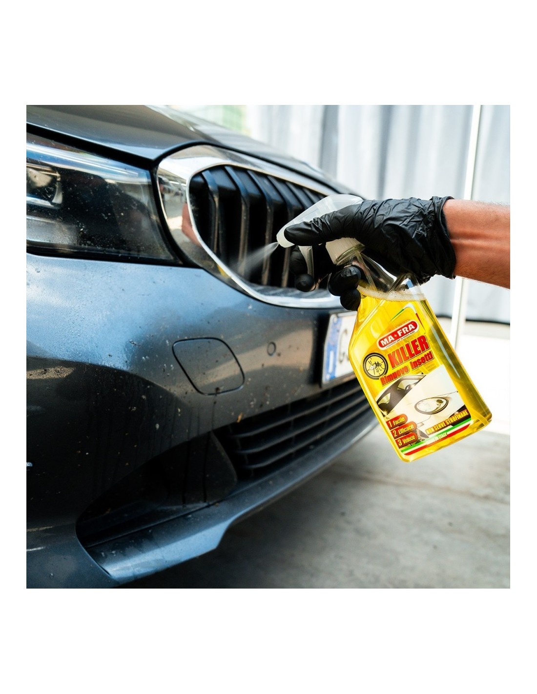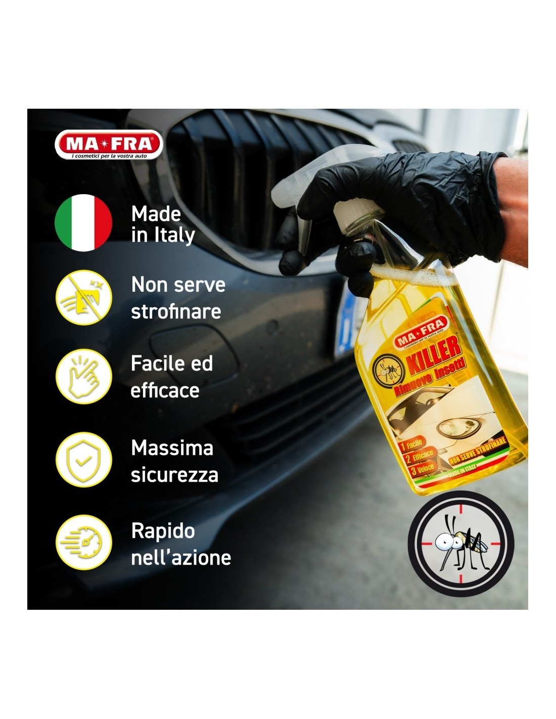 Killer di Ma-Fra nasce dalla ricerca professionale nei laboratori Ma-Fra per offrire una soluzione efficace e rapida contro ogni tipo di residuo organico sulla carrozzeria dell’auto. Insetti, moscerini, zanzare, ma le antiestetiche macchie come residui biologici di volatili dalla carrozzeria o dal tetto della vostra auto senza lasciare alcuna traccia.