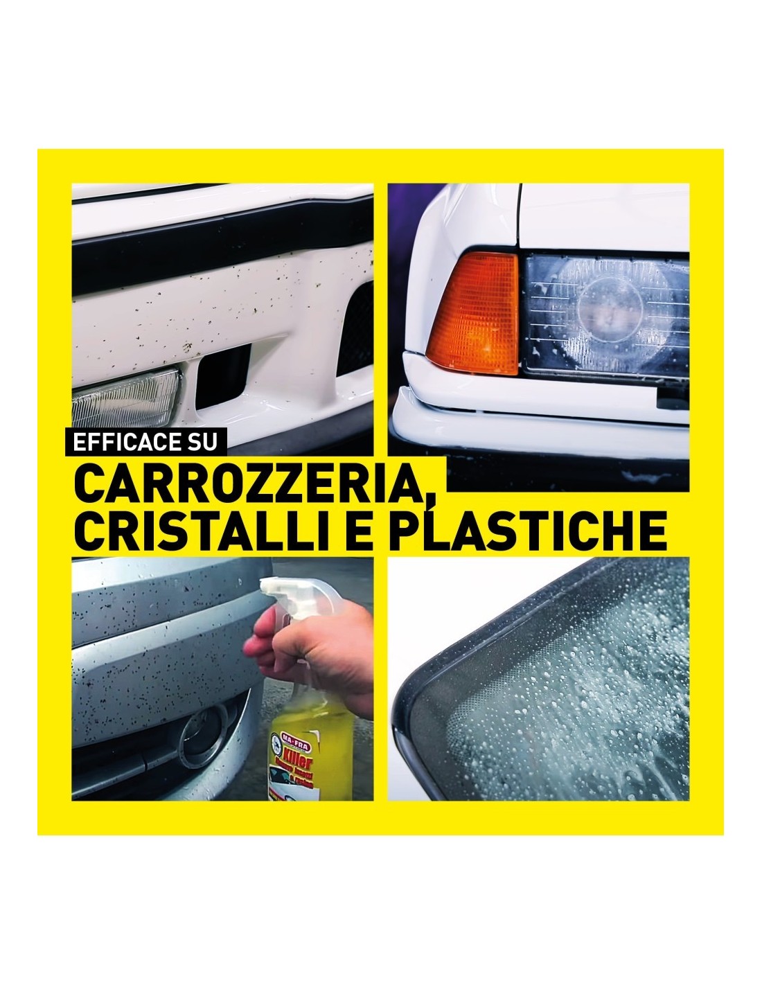 La sua formula avanzata ad azione rapida penetra e scioglie i residui anche secchi in pochi secondi, garantendo una superficie perfettamente pulita e senza aloni. Killer è sicuro su tutte le superfici esterne: carrozzeria, vetri, fanali, paraurti, cristalli e plastiche. Grazie alla sua versatilità, è ideale non solo per auto moderne e d’epoca, ma anche per moto, scooter, camper e veicoli ricreativi. Per parti della moto delicate è consigliabile diluire Killer 1:1, lasciarlo agire per circa 1 minuto, risciacquare abbondantemente e infine asciugare.