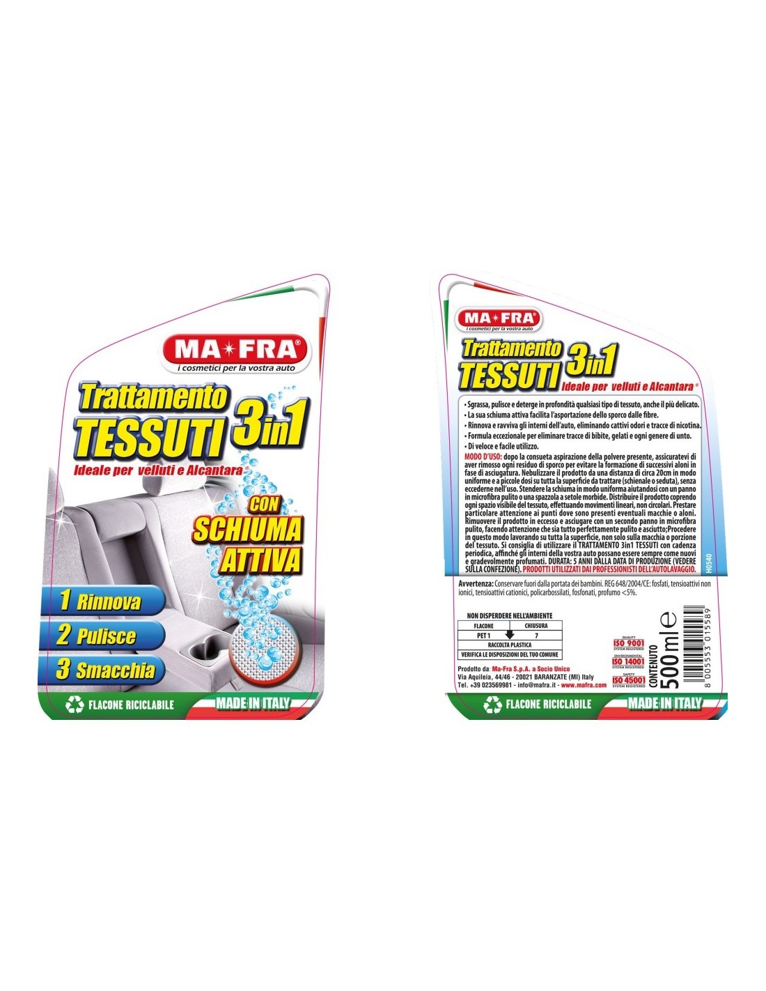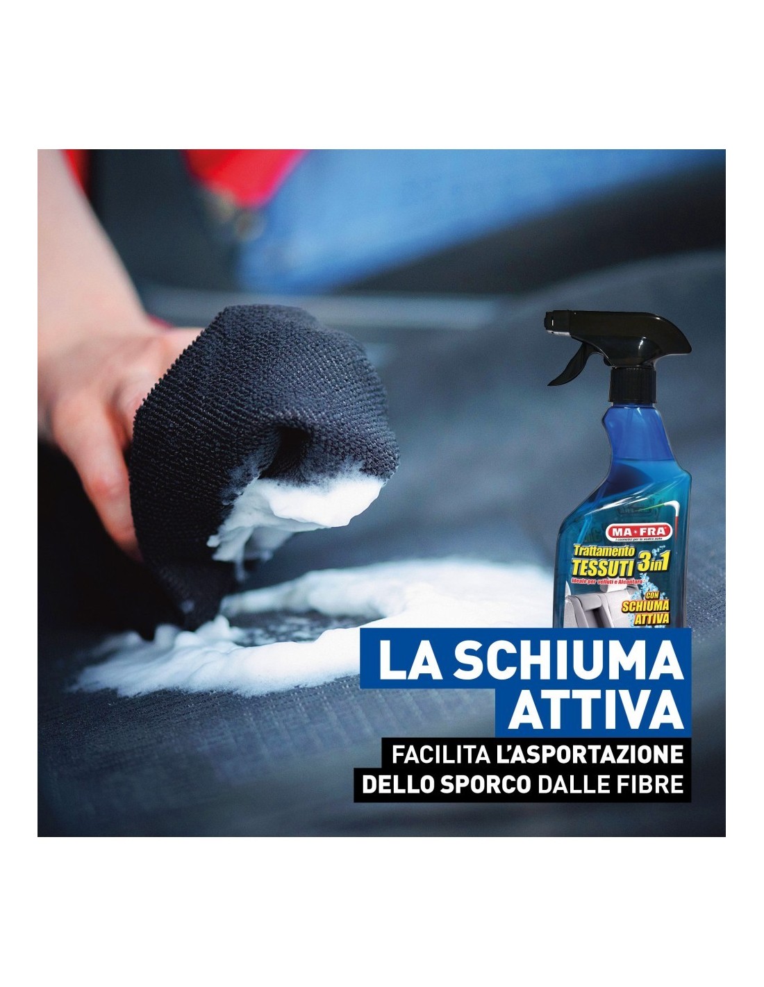 Il Trattamento 3in1 Tessuti di Mafra è studiato per chi cerca un risultato professionale senza rinunciare alla semplicità del fai da te. La sua formula a schiuma attiva ha la caratteristica di non bagnare o inumidire troppo il tessuto, così da non creare quello sgradevole effetto umidità che talvolta si presenta nell'applicazione di altri prodotti, soprattutto quando si eccede nel dosaggio.