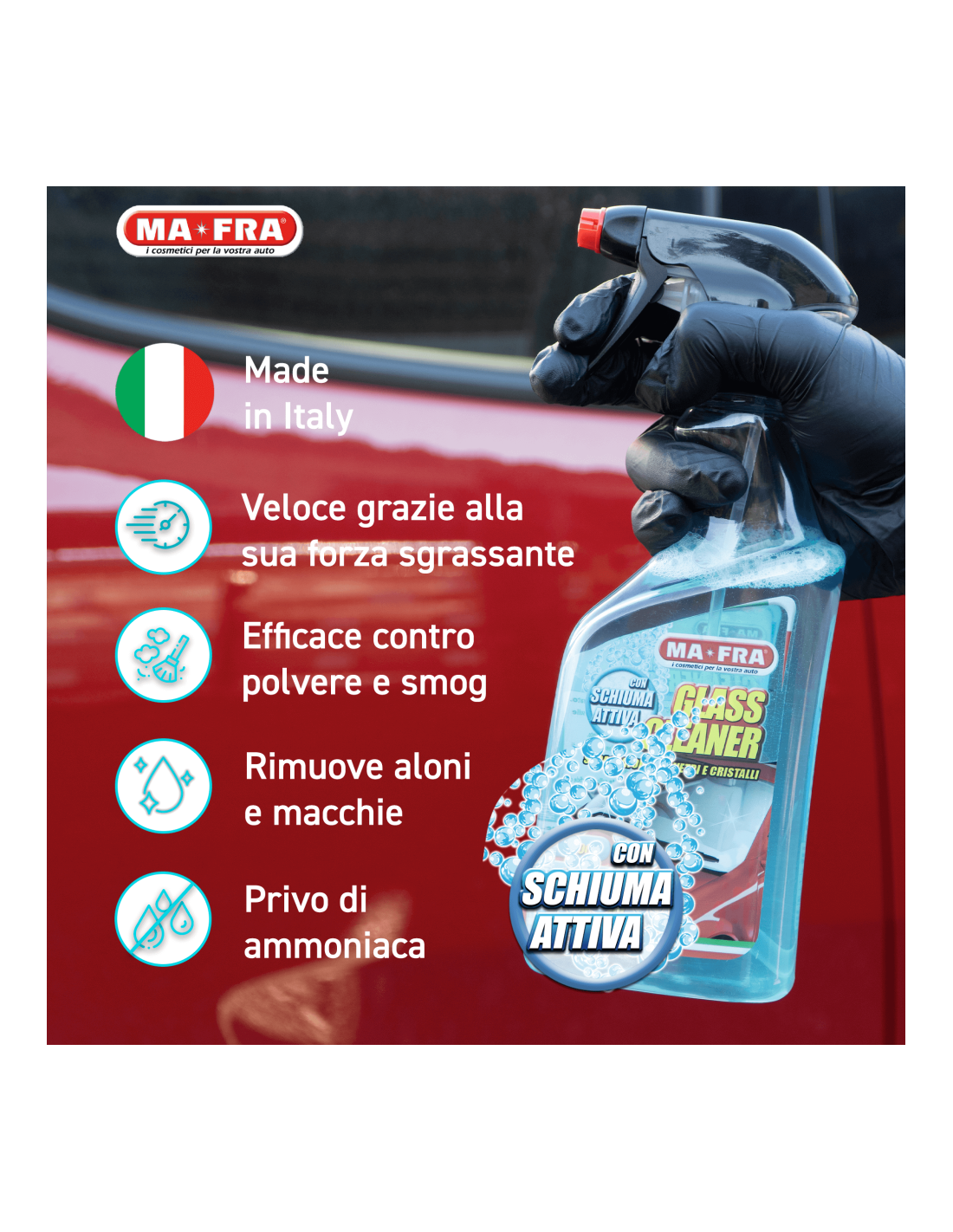 Glass Cleaner di Mafra trasforma la pulizia dei vetri in un’operazione rapida e professionale. La schiuma attiva penetra nello sporco più ostinato, scioglie grasso, polvere, unto e ogni altro genere di macchia, lasciando una superficie perfettamente trasparente.