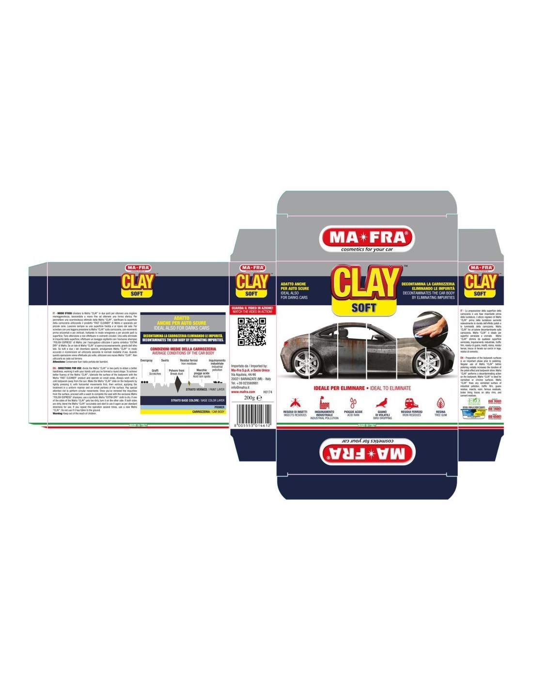 La Clay Soft di Ma-Fra è il prodotto ideale per preparare la carrozzeria prima della lucidatura. Questa pasta in argilla rimuove efficacemente ogni tipo di contaminante, restituendo una superficie liscia e brillante.