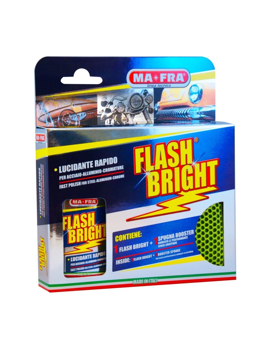 Kit Flash Bright è il polish rapido ideale per riportare a specchio cromature, acciai, ottoni e leghe senza alcuna fatica. La sua formula avanzata lavora in profondità, eliminando ossidazioni leggere e piccoli graffi senza lasciare aloni.