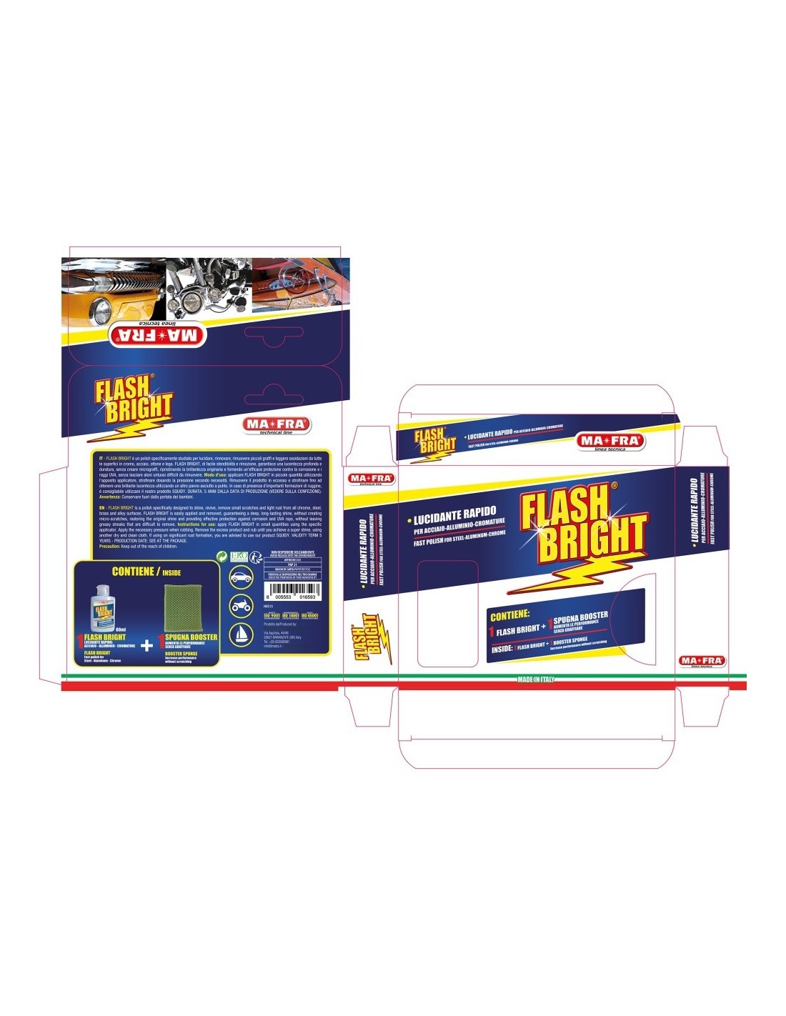 Facile da applicare e di facile stendibilità e rimozione, Kit Flash Bright, garantisce una lucentezza profonda e duratura, senza creare micrograffi. Un trattamento con questo Kit ripristina la brillantezza originaria della superficie e fornisce un’efficace protezione contro la corrosione e i raggi UVA.