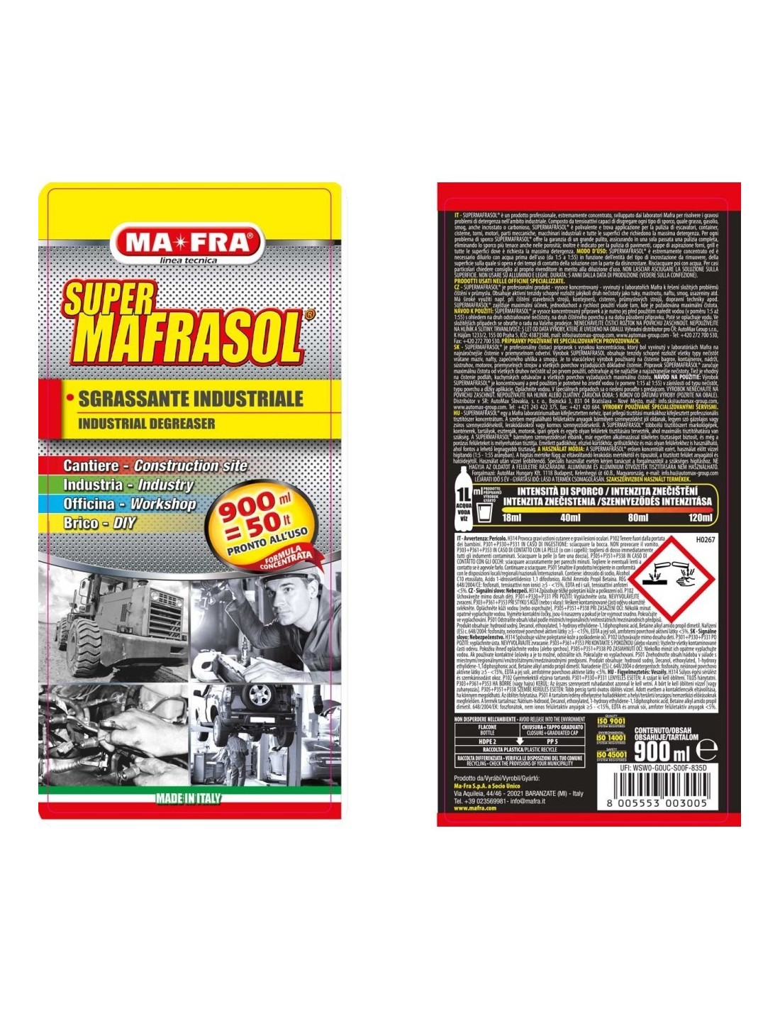 Supermafrasol di Mafra è uno sgrassatore industriale professionale ad alte prestazioni, ideale per affrontare incrostazioni di grasso, olio, smog e depositi carboniosi. La sua formula è studiata per garantire una detergenza intensiva, anche sulle superfici più porose e sporche.