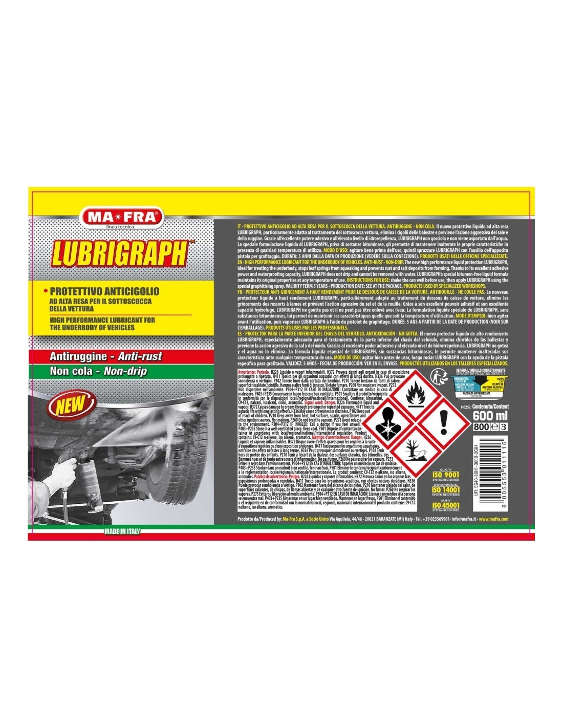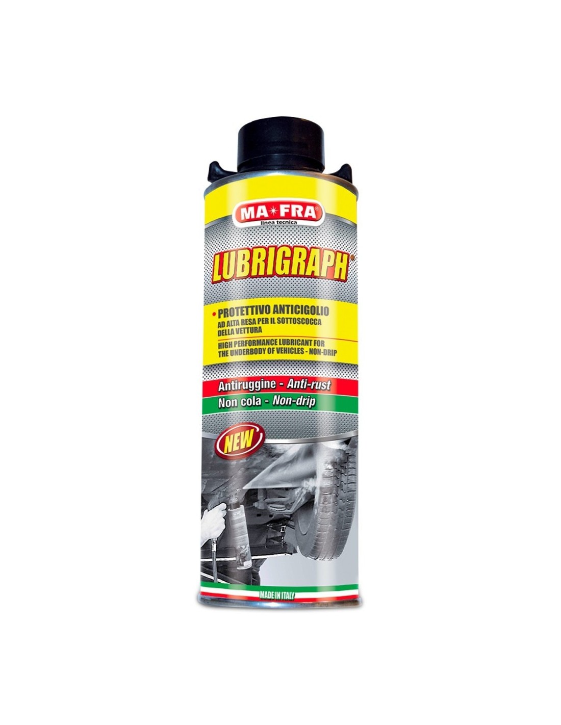 Lubrigraph è un protettivo ad alte prestazioni studiato per il trattamento del sottoscocca di auto e fuoristrada. La sua formula, a base di materie prime selezionate, offre una resa fino a tre volte superiore rispetto alla tradizionale grafite nera, garantendo una protezione continuativa senza indurire nel tempo.