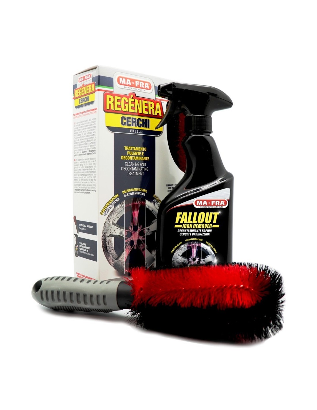 - Fallout Iron Remover 500ml: sciogliere chimicamente la polvere dei freni e i residui ferrosi grazie alla sua speciale formula converte e dissolve chimicamente i residui ferrosi creando una soluzione violacea facilmente risciacquabile.