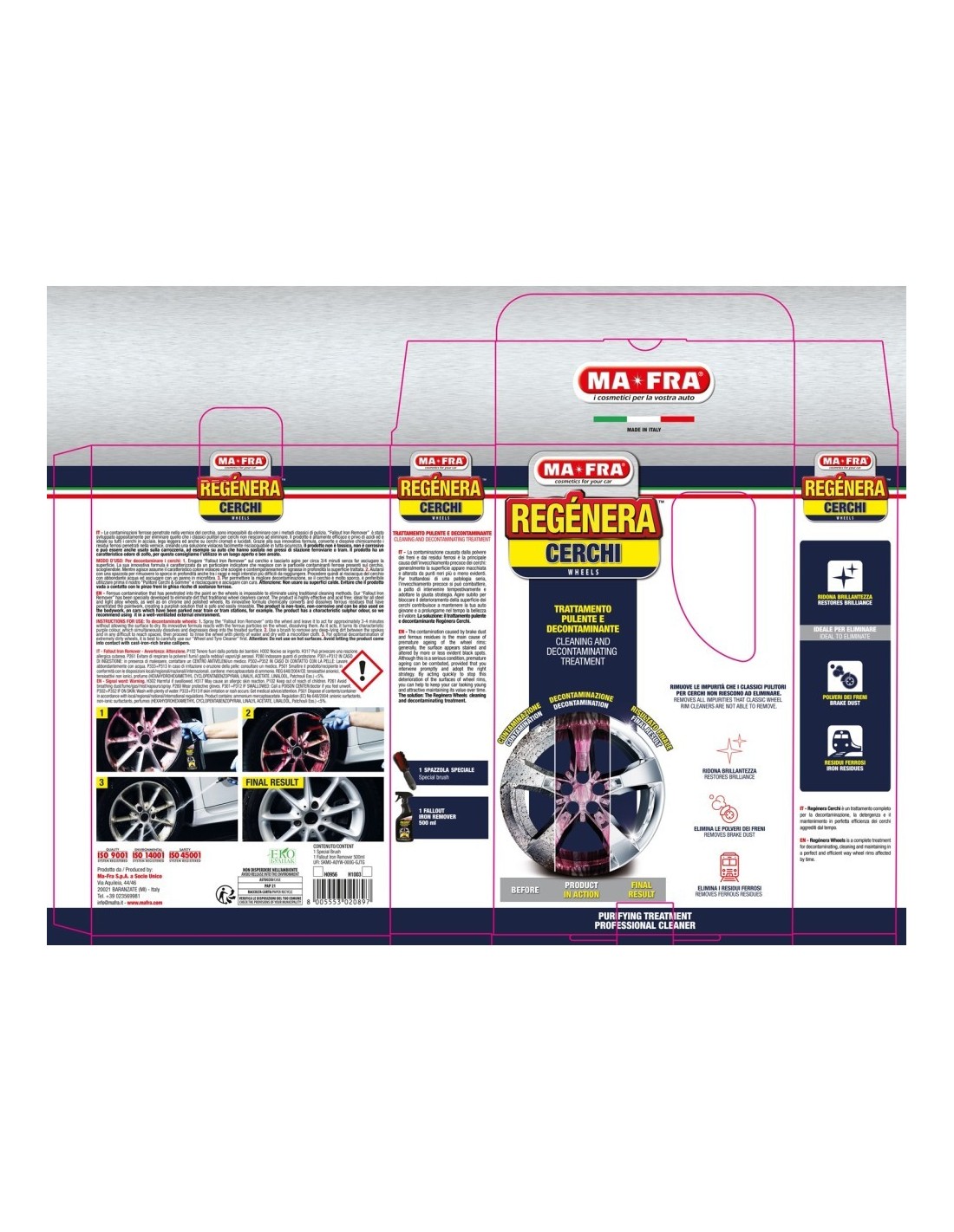 Impurità come la polvere dei freni e i residui ferrosi penetrate nella vernice del cerchio sono impossibili da rimuovere con i classici metodi di pulizia, causando un invecchiamento precoce dei cerchi che risultano macchiati e alterati da punti neri più o meno evidenti. Per rimuovere a fondo queste contaminazioni bisogna applicare un trattamento specifico, ecco perchè Mafra ha pesato al Kit Regénera Cerchi.