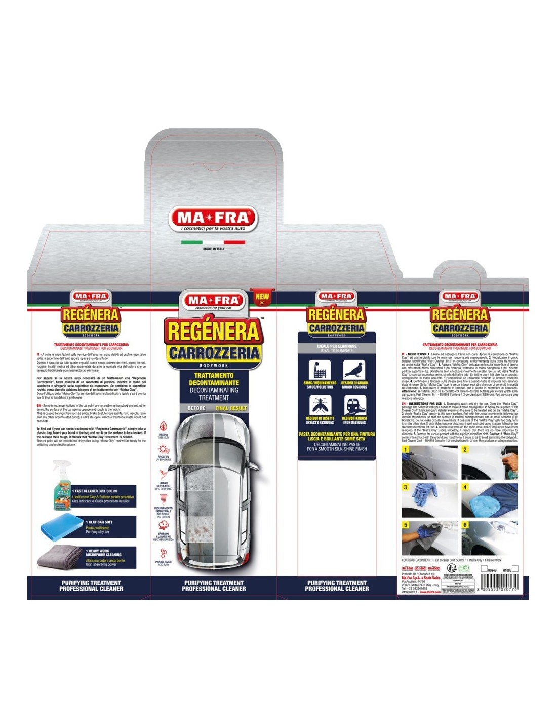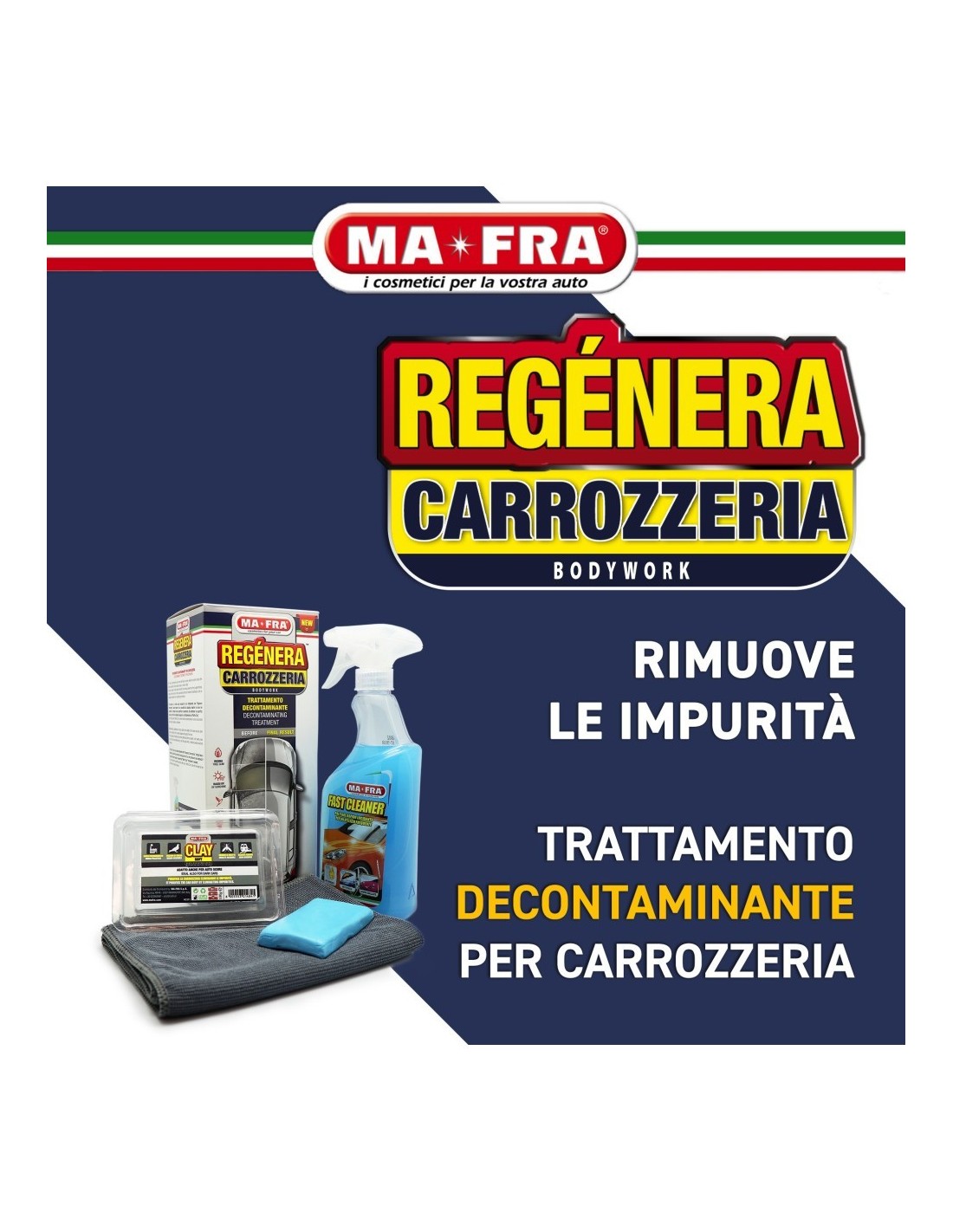 Il Kit Regénera Carrozzeria di Ma-Fra unisce tre prodotti professionali per una decontaminazione meccanica efficace, ideale per rinnovare le superfici. Questo Kit è composto dai seguenti prodotti: