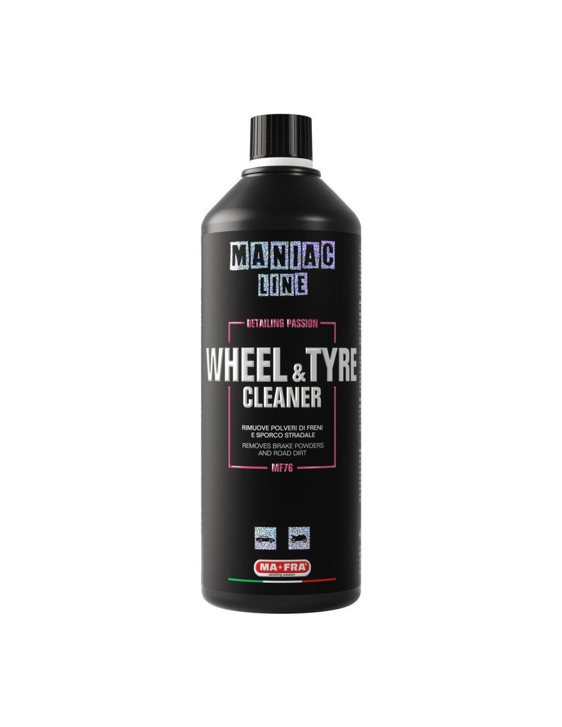 Wheel & Tyre Cleaner Maniac Line è il detergente per cerchi e pneumatici studiato per sciogliere in un solo passaggio polvere dei freni e sporco stradale. La sua formula genera una potente schiuma lubrificata che stacca efficacemente residui e contaminanti senza aggredire le superfici.