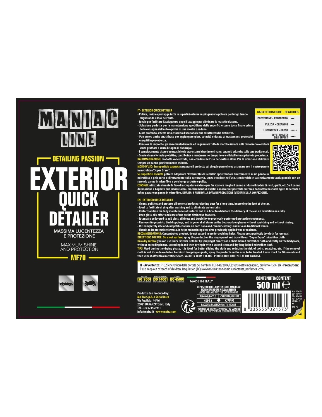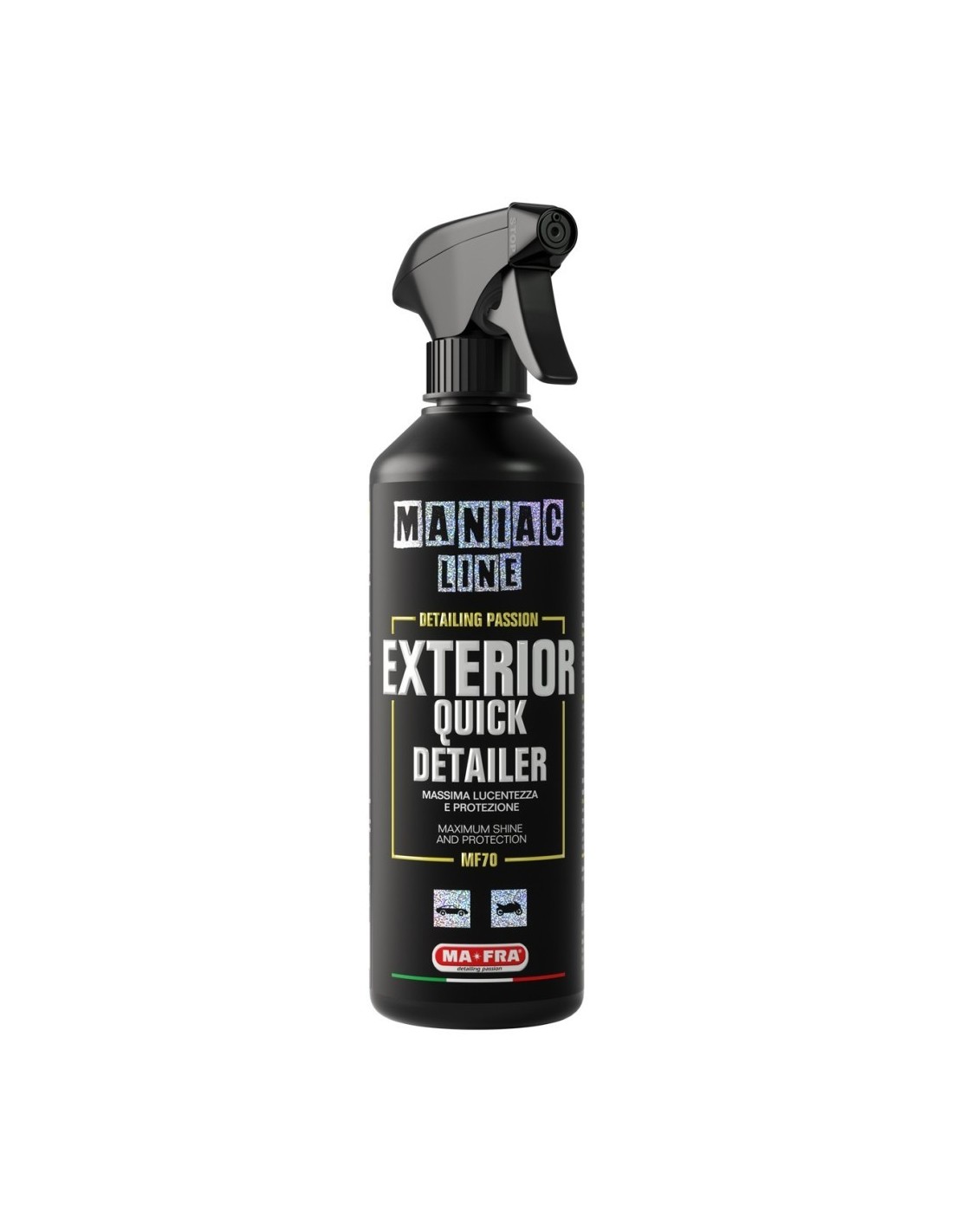 Exterior Quick Detailer di Maniac Line è un pulitore a secco professionale, ideale per eliminare le macchie d’acqua dopo il lavaggio, rimuovere impronte, escrementi di volatili e aloni. Il prodotto è ideale per interventi rapidi anche in condizioni meteo variabili.