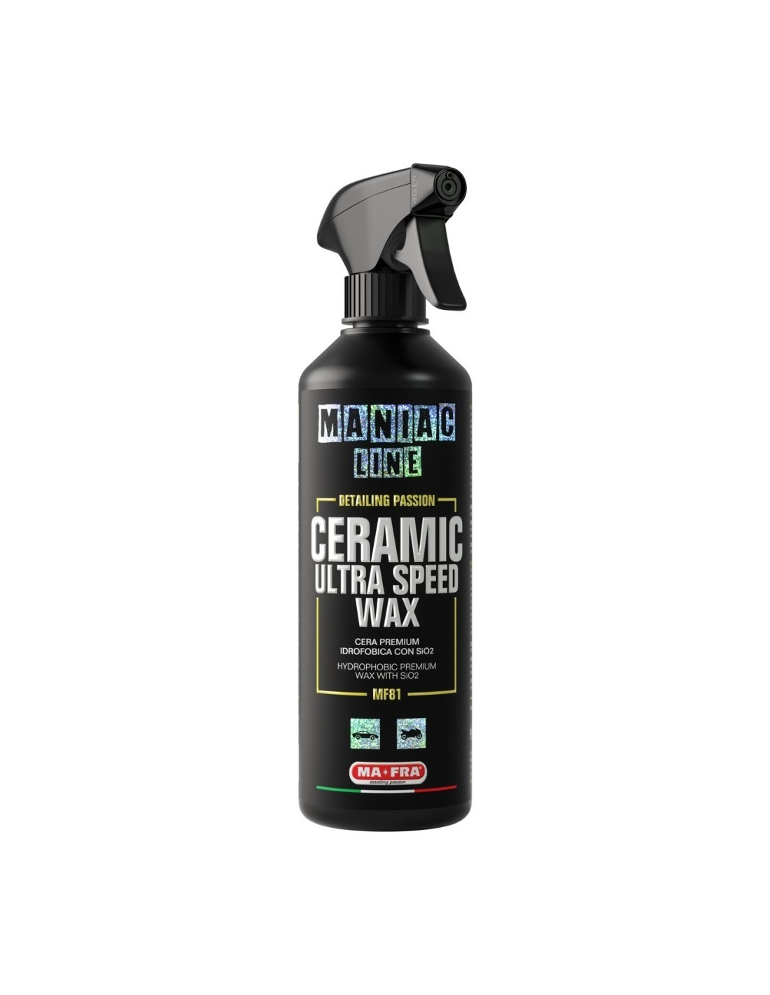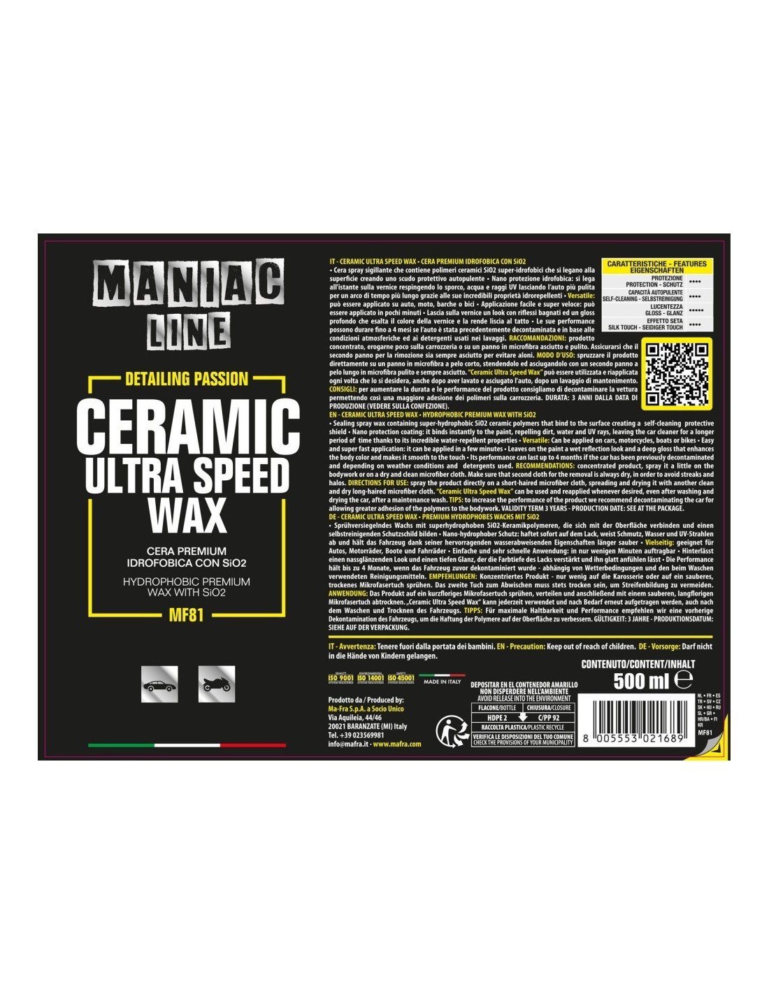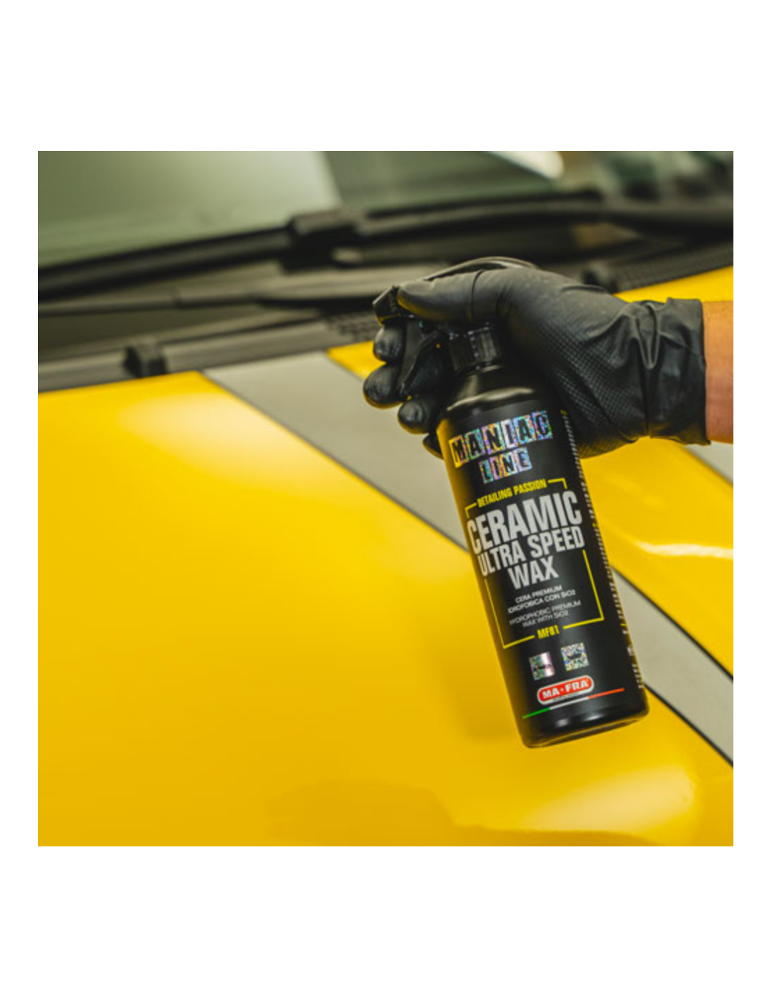 Ceramic Ultra Speed Wax di Maniac Line è la cera spray sigillante che unisce le migliori caratteristiche delle cere con l’avanzamento tecnologico portato dai protettivi nanoceramici, pensata per chi desidera una finitura brillante e una protezione duratura in pochi minuti.