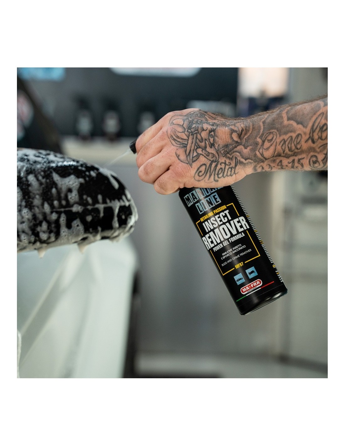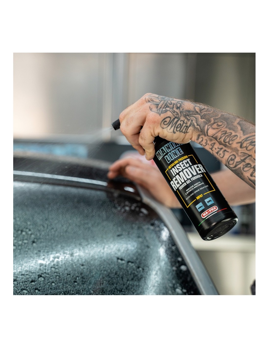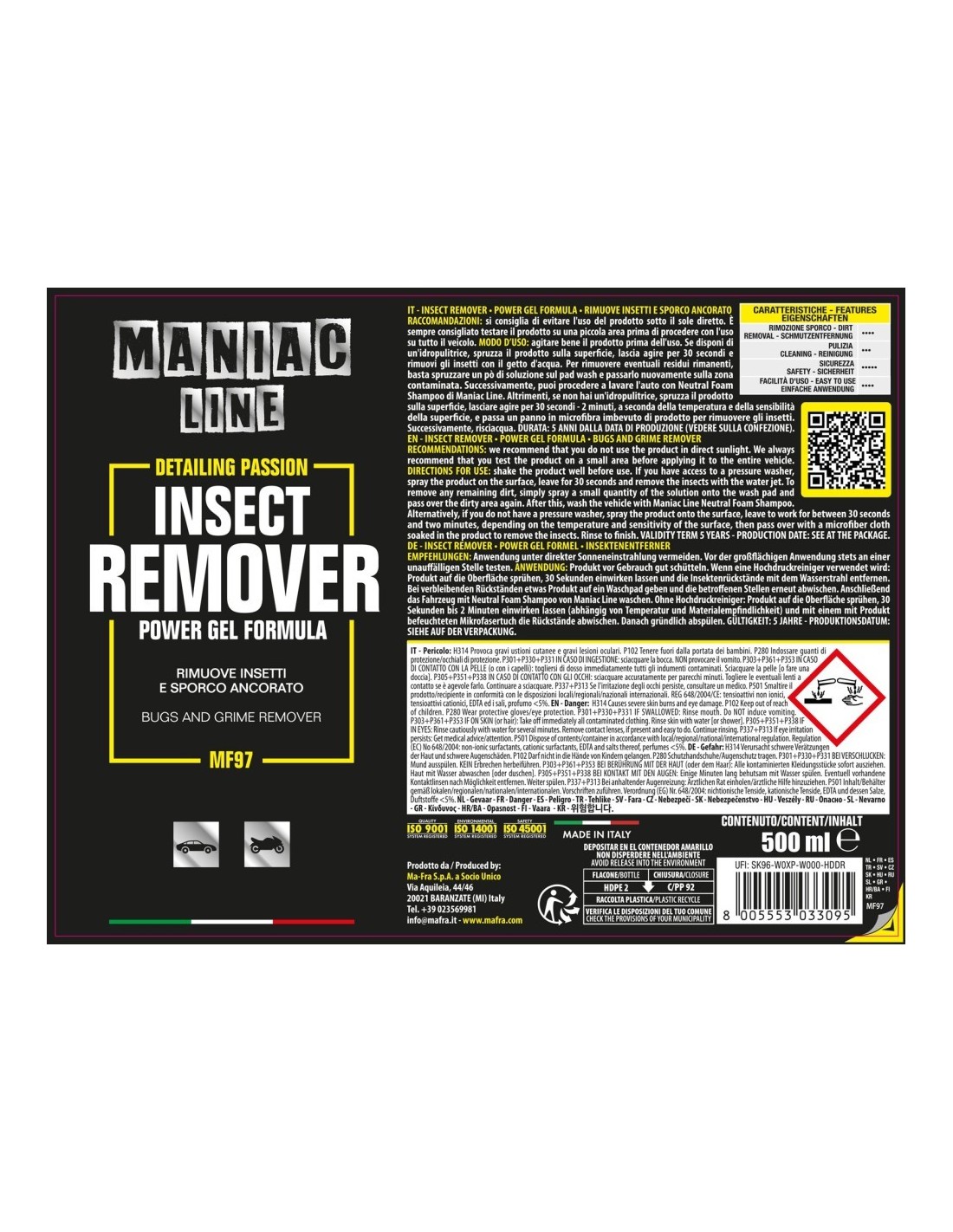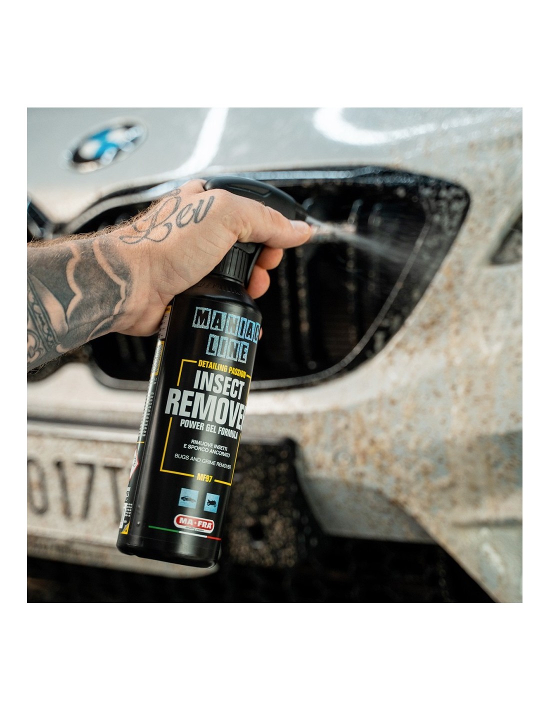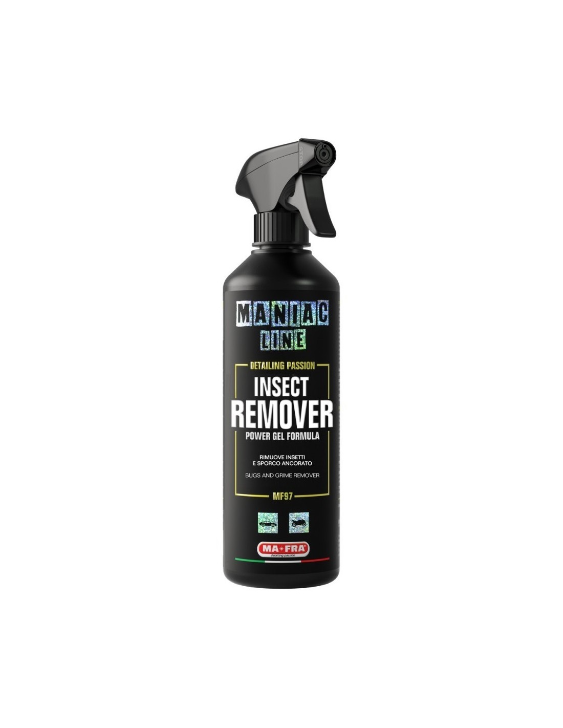 Insect Remover di Maniac Line è il prodotto ideale per eliminare i residui di insetti dalla carrozzeria senza compromettere la finitura. Gli enzimi e le proteine presenti nei resti degli insetti possono aggredire le superfici delle auto e, se non vengono rimossi in tempo, possono provocare macchie persistenti che richiedono una lucidatura dell’auto.