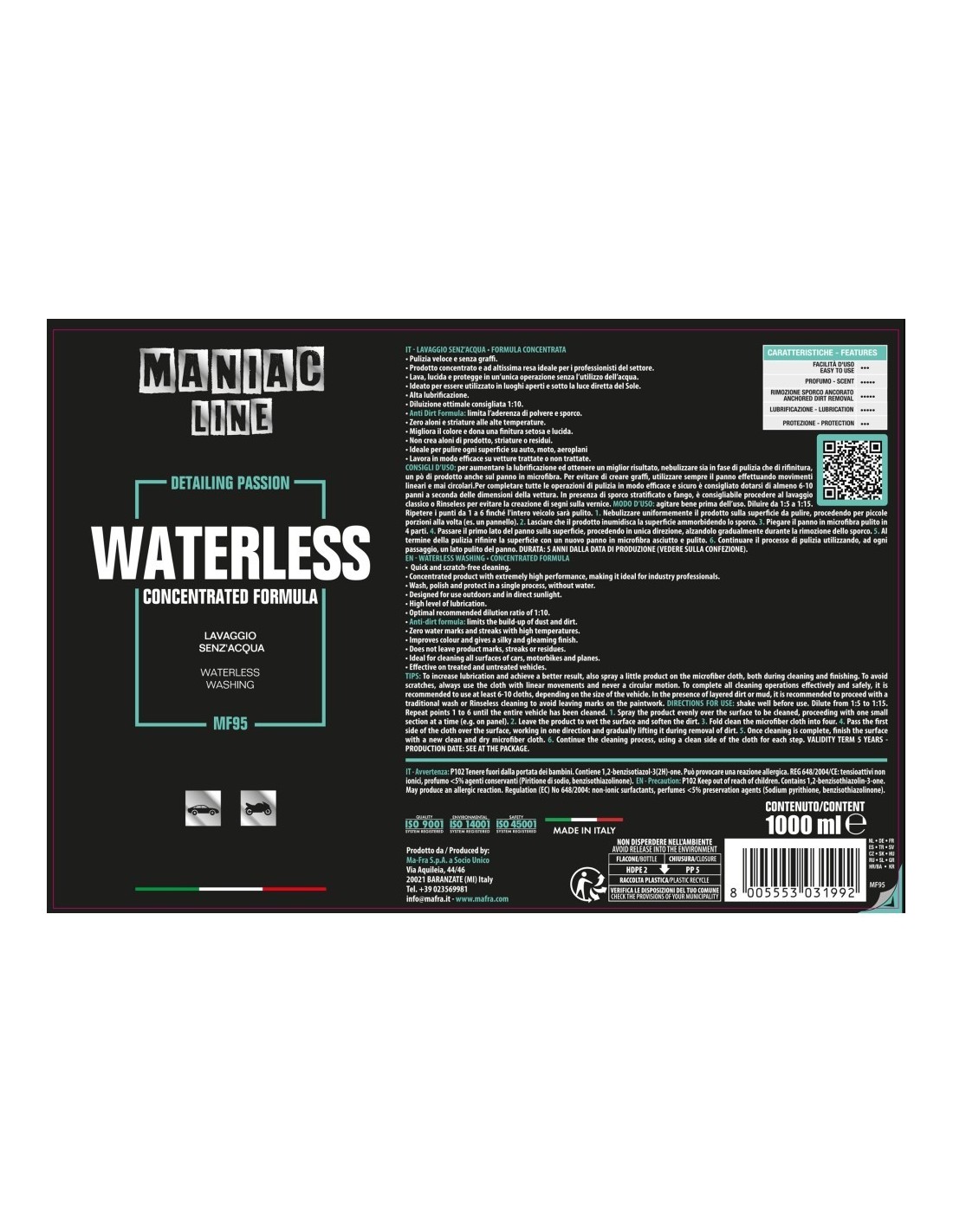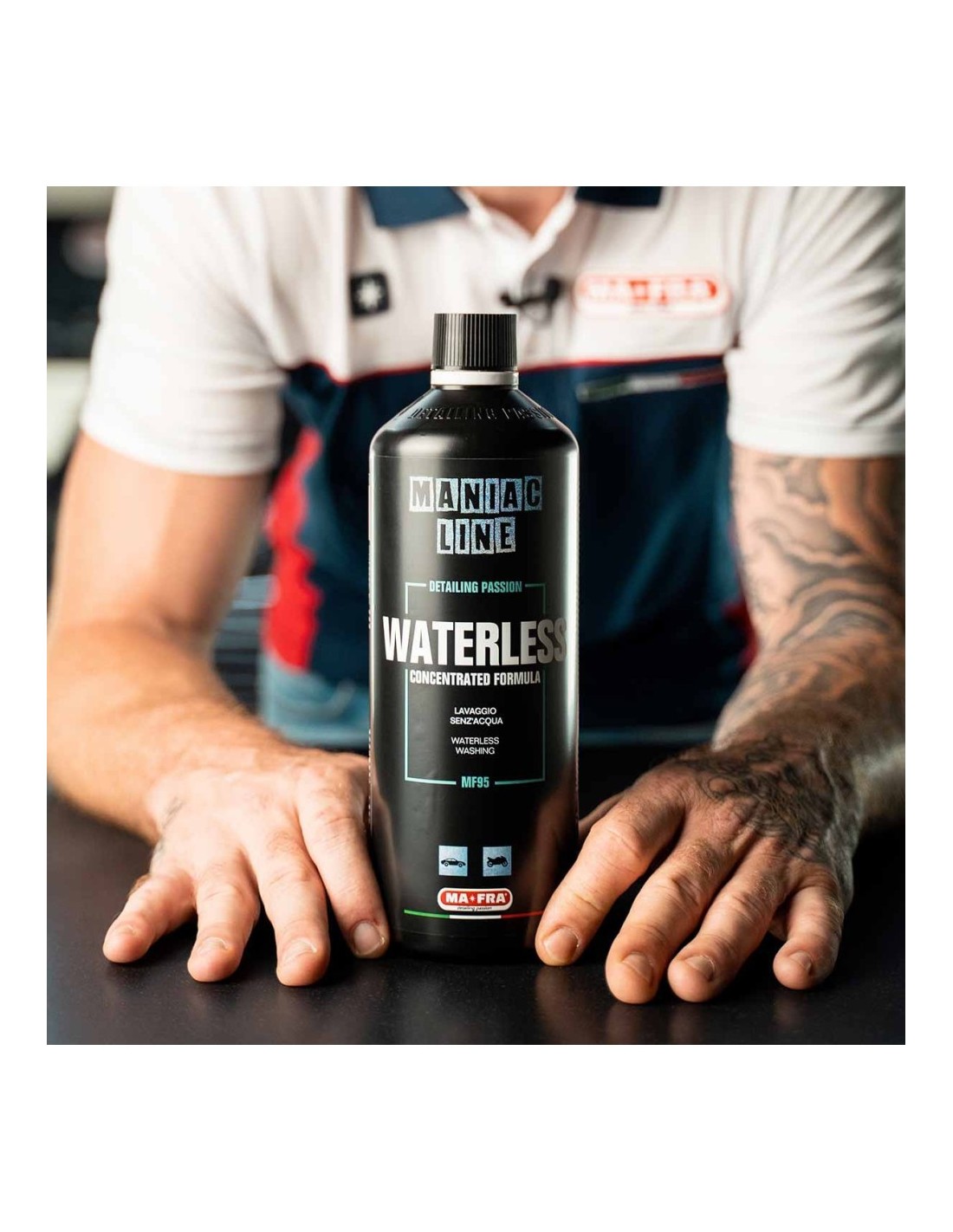 Waterless, della linea Maniac, è un rivoluzionario pulitore senza acqua che offre anche una straordinaria brillantezza, ed è stato appositamente formulato per essere compatibile con rivestimenti nanotecnologici. Questo prodotto presenta un’innovazione unica: può essere utilizzato in totale sicurezza anche sotto la luce diretta del sole o in condizioni di temperature elevate, senza lasciare aloni, striature o macchie dovute all’evaporazione.