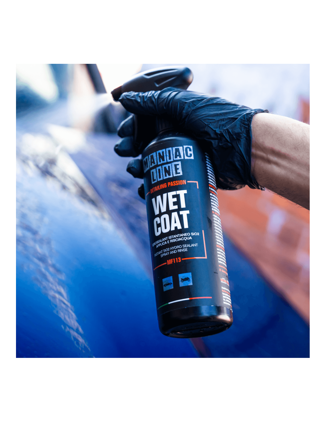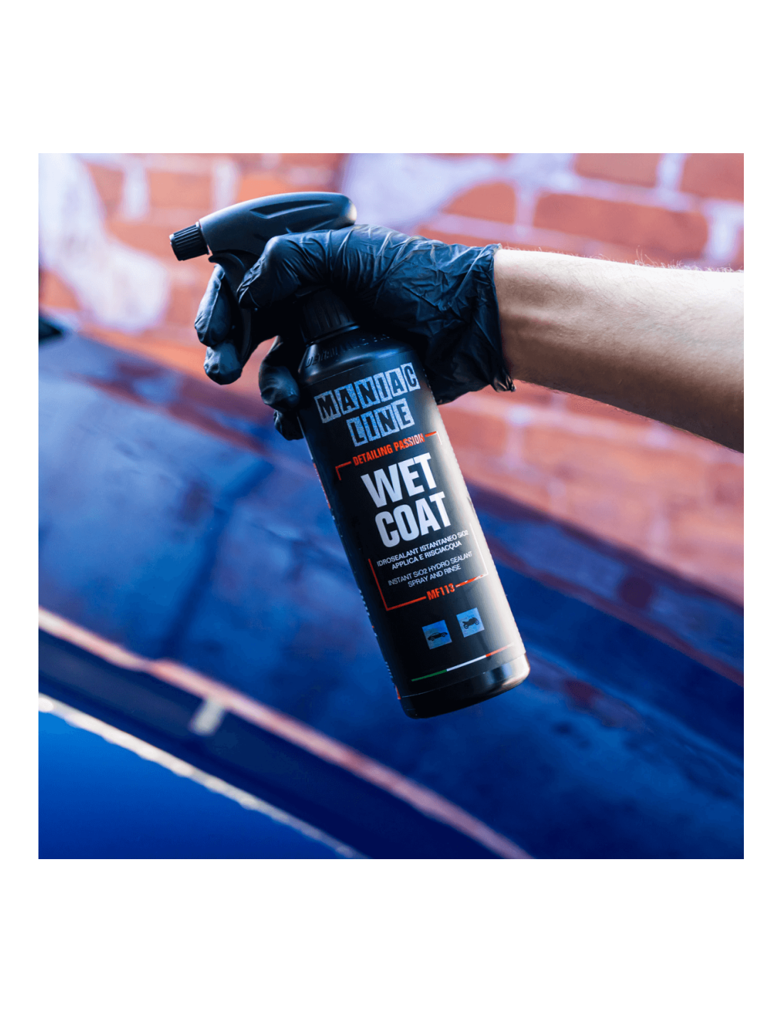 Wet Coat Maniac Line è versatile e trasversale: può essere utilizzato su vernici, vetri, plastiche e cerchi, assicurando un effetto idrofobico uniforme e una brillantezza amplificata su ogni dettaglio esterno del veicolo.